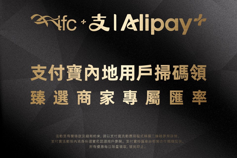 即日起至2026年12月31日,支付宝内地用户可于ifc商场指定线下商户使用支付宝应用程式扫描指定二维码,即可享有臻选商家专属汇率!